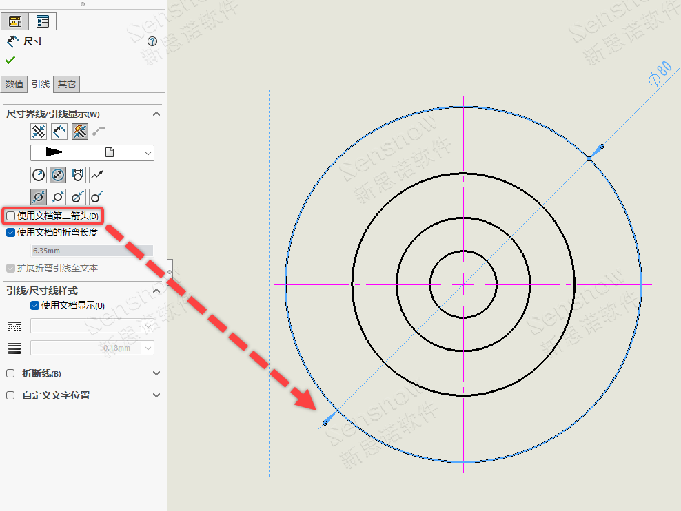 然后我们勾选:选项 -> 文档属性 -> 尺寸 -> 直径 -> 显示第二向外箭头,勾选后再创建直径尺寸会发现默认就会显示直径尺寸的两个箭头,一切将恢复正常。