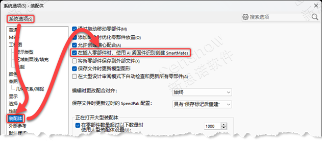 要打开自动识别功能,需勾选:选项 -> 系统选项 -> 装配体 -> 在插入零部件时,使用 AI 紧固件识别创建 SmartMates。