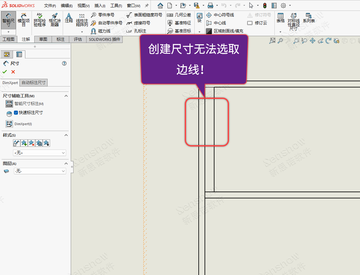 客户反馈:打开以前制作的一张分离的工程图中出现了无法创建尺寸标注的现象,鼠标悬停在视图元素上后应当在鼠标光标附近出现的动态高亮显示效果也不会工作,点击智能尺寸点选视图都无法创建需要的尺寸!