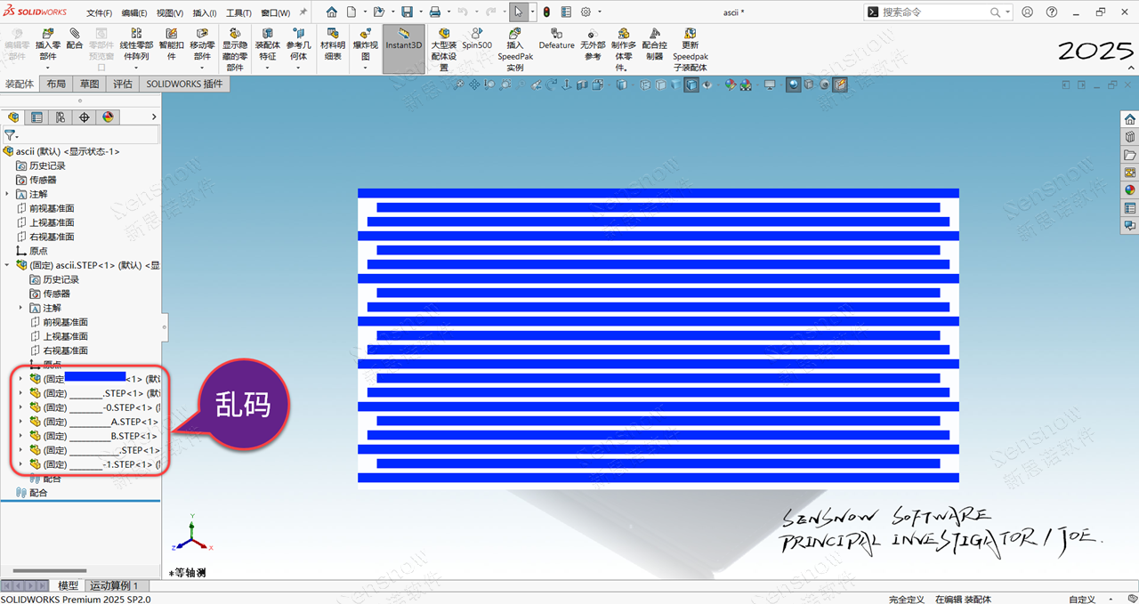 相信大家都遇到过这种问题,在新版本 SOLIDWORKS 中导入 STEP 文件后 FM 设计树名称出现一堆横线的乱码现象!只有在高版本 SOLIDWORKS 中才会存在此问题,客户使用 2020 版本导入 STEP 则一切正常,可以正常在 FM 设计树显示正确的汉字(导入名称)。