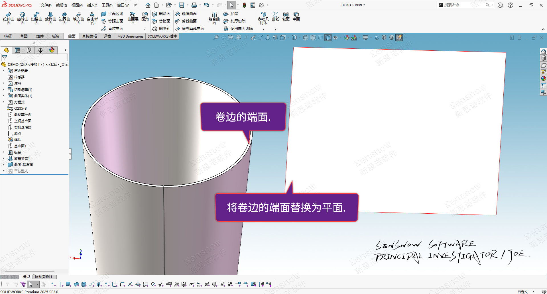 此时,我们可以在 SOLIDWORKS 中创建两处基准平面分别绘制草图,将卷边的模型面使用转换实体引用的方式投射到基准面中,然后使用平面区域功能创建平面曲面,最后再使用替换面的方式将卷边面替换为平面即可。处理过后的模型再次创建倒角特征就不会复发此问题了,也不会影响到钣金的展开。