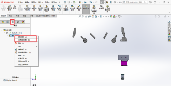 06、最后我们点击设计树中的配置,展开找到“爆炸视图”,鼠标右击,我们选择“解除爆炸”或“动画解除爆炸”。至此,整个爆炸效果完成。