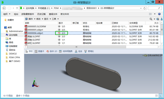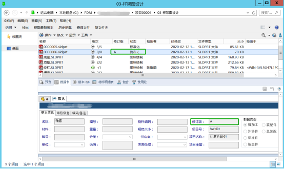 通过SOLIDWORKS CAD可以直接将设计数据保存在PDM客户端中, 并可通过P DM 预览功能查看设计数据。设计完成,可将数据检入服务器,系统会记录本次检入的版本。对于PDM而言,版本管理分为两个概念,一个是 版次,一个是 修订版。版次指的对于设计数据修改过程的管理,这个对于建立企业研发产品知识库非常有用。修订版指的设计数据在通过审签流程后,最终用于生产或者采购的定版,例如A1,A2,A3……