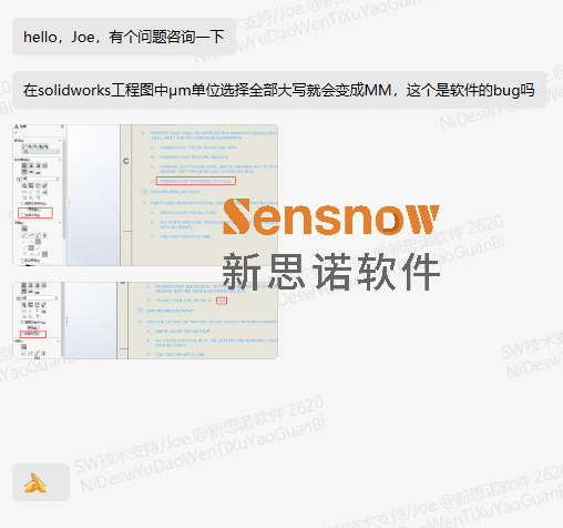 经过验证,此现象是与特殊符号的输入方法有关,用户使用了搜狗或微信输入法来创建 'μm' 字符导致的。所以问题的发生在于输入法本身的设计与 SOLIDWORKS 程序不够兼容有关,但这类问题不能被判定为 SOLIDWORKS 程序的软件 BUG 。