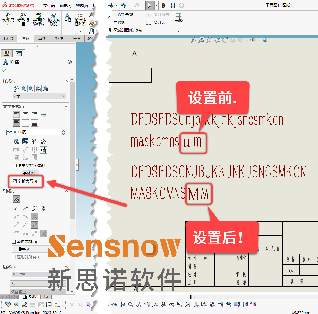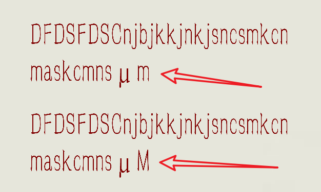 用户为外资企业,需要英语版本图纸。在创建技术要求的注释时将整个注释设置为 '全部大写' 后常规字母可以按预期改变,但唯独微米符号 'μm' 在使用此选项后出现了乱码,将 'μ' 错误的转换为了 'm' !