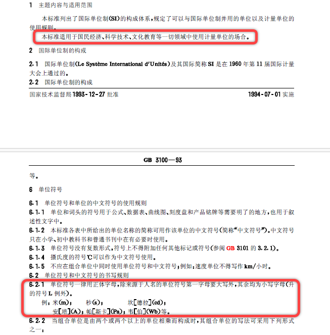 此标准适用于国民经济、科学技术、文化教育等一切领域中使用计量单位的场合。中国存在计量法,现在行业标准都是GB/T,而此标准则是GB,是强制标准、必须执行的法规,否则将存在违法风险(外资企业也必须遵循)。