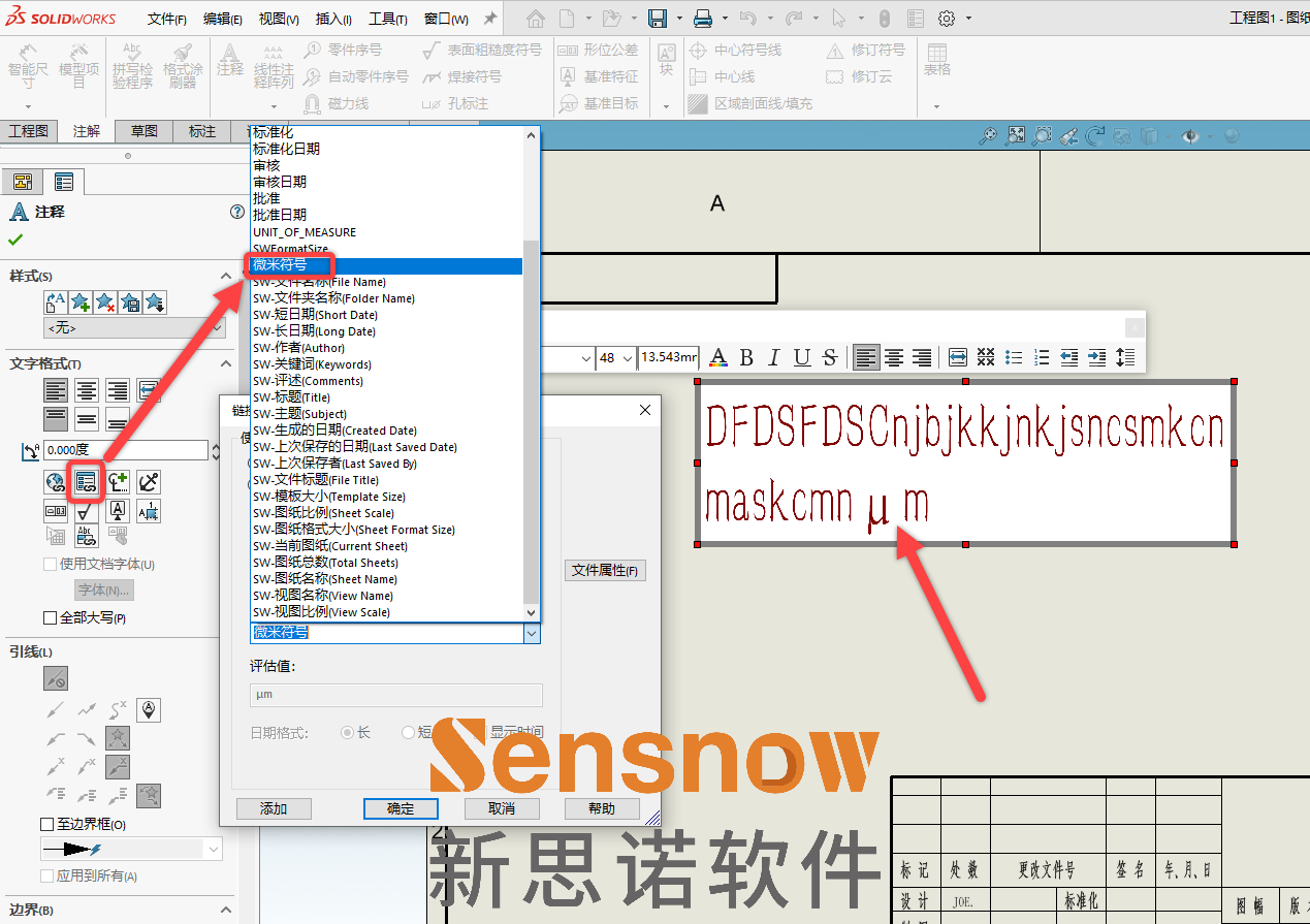 可在工程图自定义属性中创建一个名称为 '微米符号' 的属性,属性表达式使用我们常用的输入法将微米字符 'μm' 进行输入,计算的结果值就是符号。