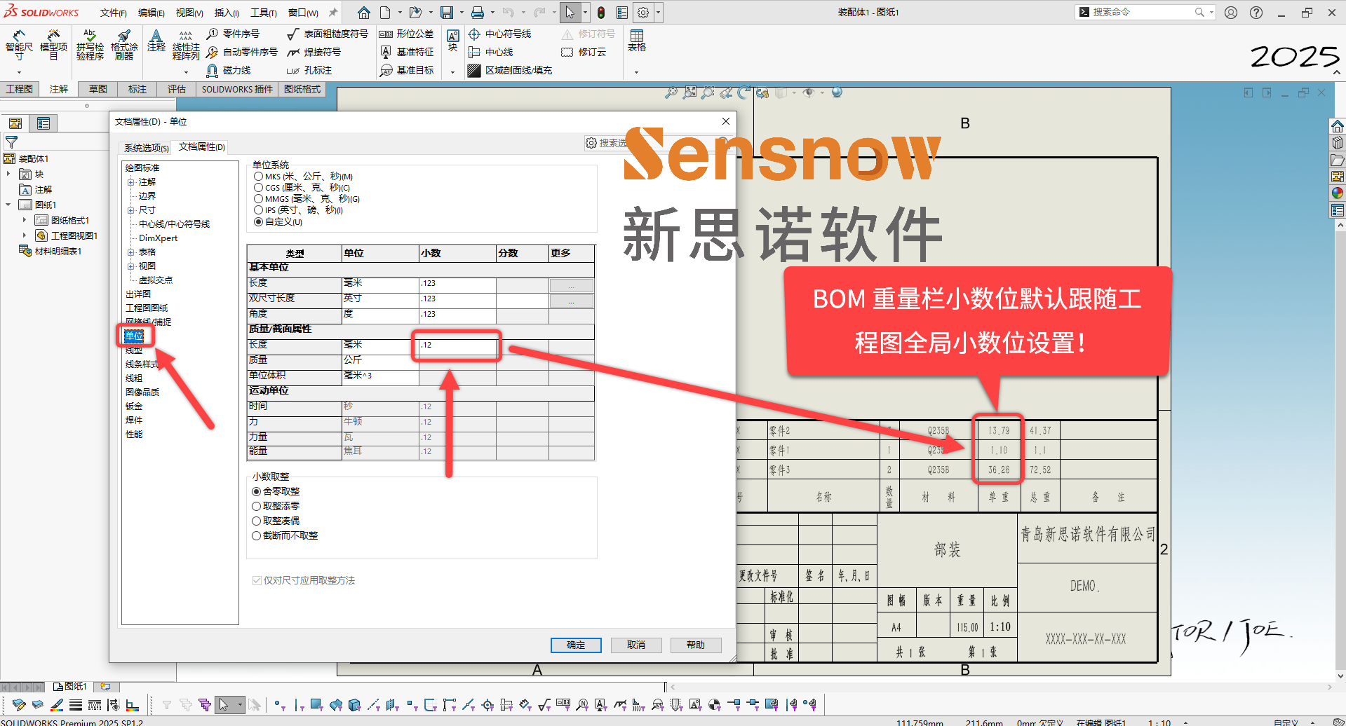 用户希望 BOM 表中的重量栏小数位可以单独控制,不要跟随工程图图档的单位设置来显示其小数位。