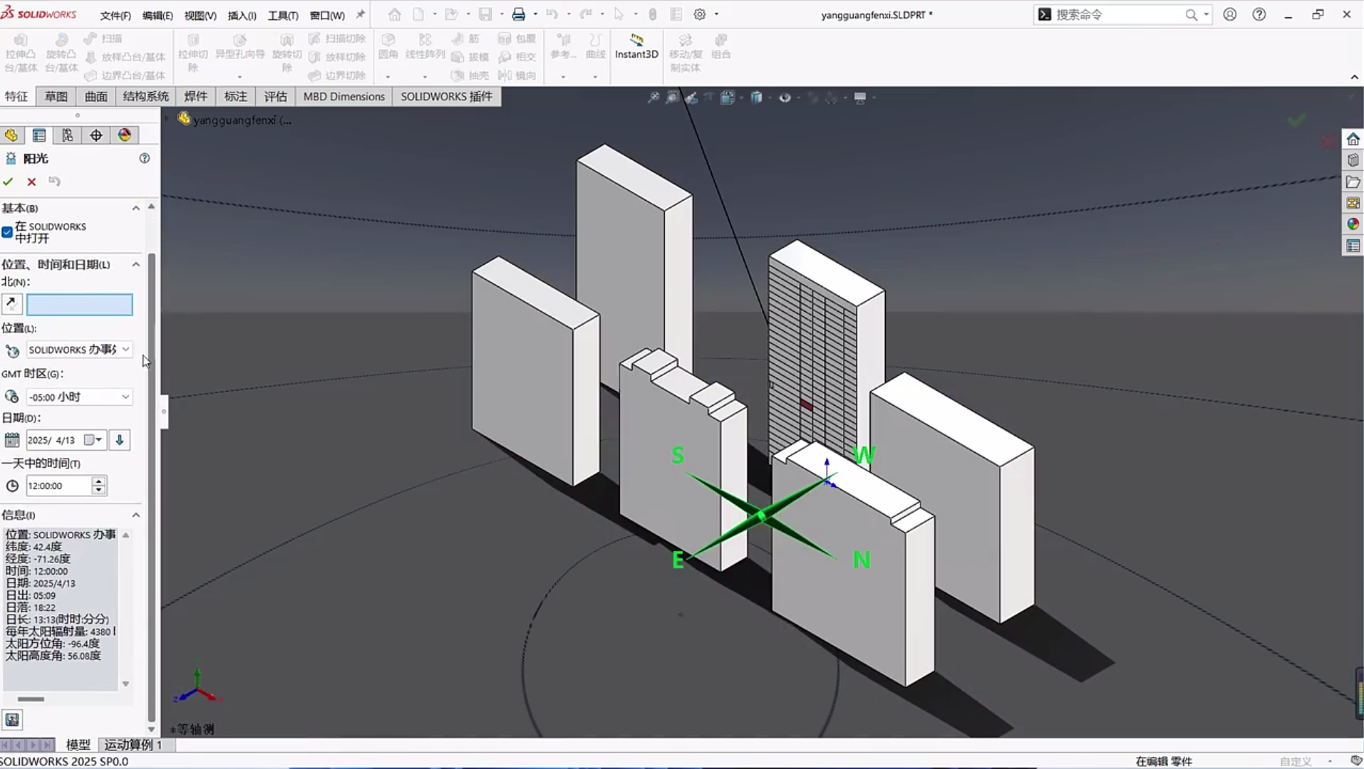 SOLIDWORKS软件日光功能用于分析阳光光照及阴影情况,SOLIDWORKS日光功能需要考虑位置、日期、时间等条件: