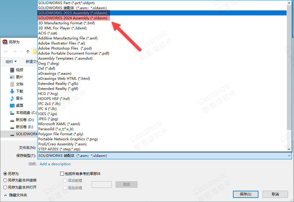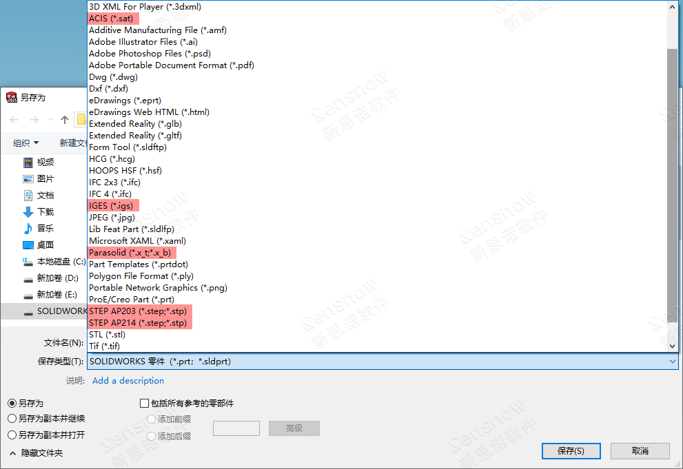 转档中性(中间)图档格式让低版本 SOLIDWORKS 软件读入,常见的格式有:Parasolid(*.x_t/*.x_b)、ACIS(*.sat)、STEP 203/214/242、IGES(*.igs)。