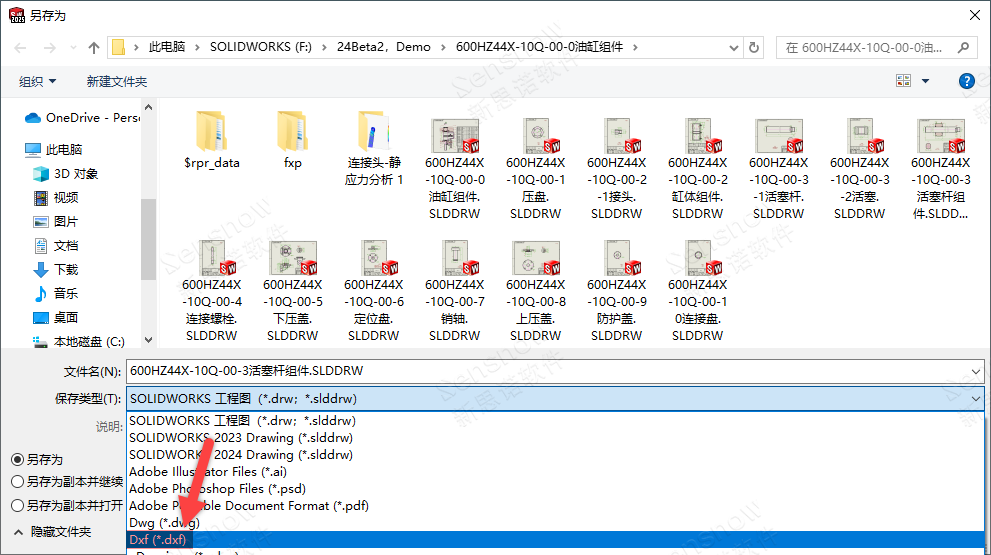 转档为这种类型的中性图档格式后低版本 SOLIDWORKS 所读入进来的图档仅仅包含图形,模型创建特征会全部丢失。3D CAD 的 2D 工程图图档同样也有中性格式,以供低版本程序读入,而 2D 领域的中性图档格式为 .DXF 。